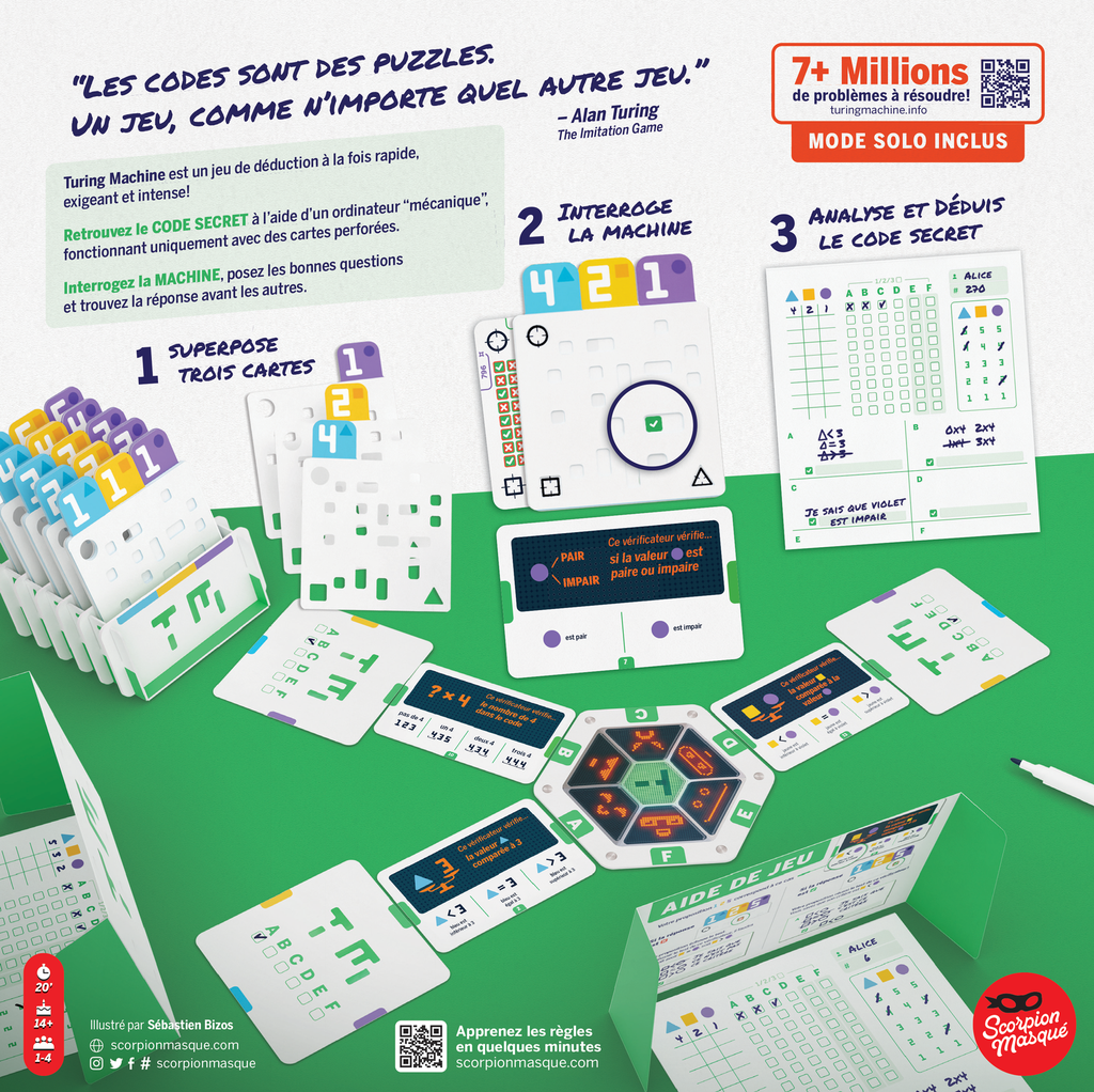 Turing Machine est un jeu de déduction compétitif unique en son genre. Retrouvez le code secret à l’aide d’un ordinateur « mécanique » fonctionnant avec uniquement des cartes perforées. Interrogez la machine, posez les bonnes questions et trouvez la réponse avant les autres.