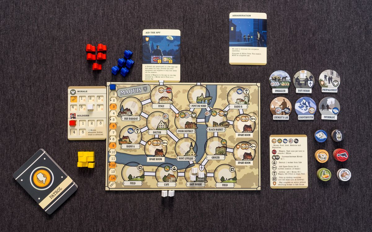 Maquis est un jeu de placement d'ouvriers en solitaire avec des objectifs variables et un temps de jeu d'environ 30 minutes. Le joueur place ses membres de la Résistance dans des zones autour de la ville pour atteindre ses objectifs - faire sauter des trains, publier des journaux clandestins - mais en même temps, des collaborateurs de Milice et des soldats de la Wehrmacht patrouillent la zone. Les agents qui ne peuvent pas retourner à la planque à la fin de la journée sont arrêtés et ne sont plus jamais revus.